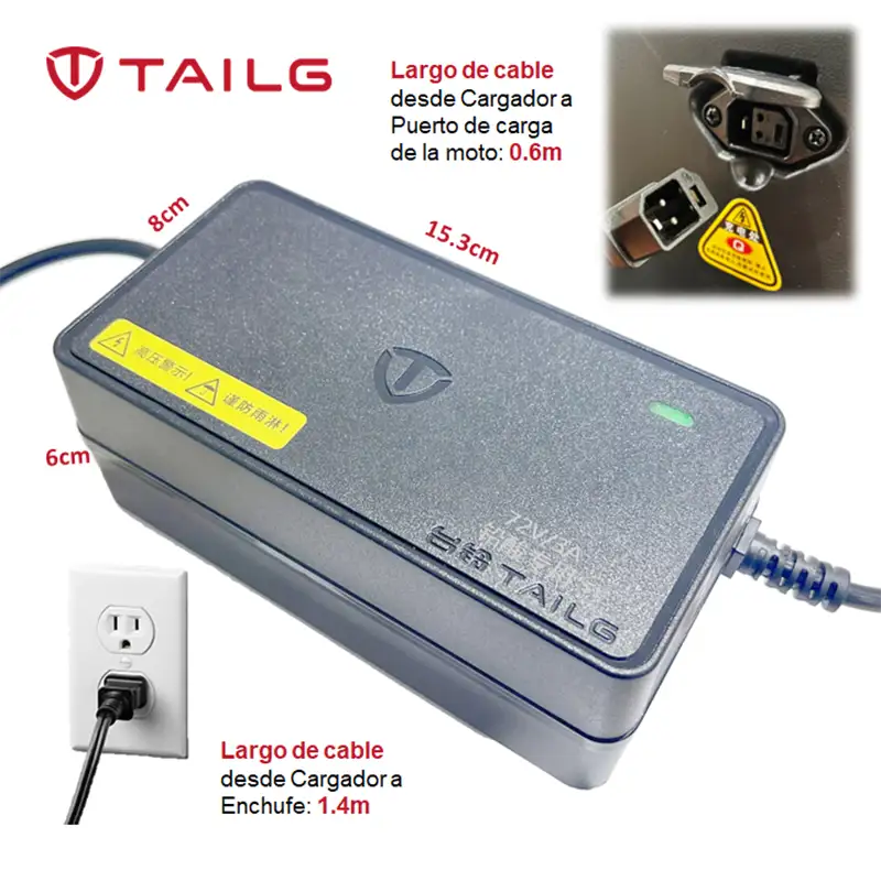 Aplica para los modelos TAILG A1 Plus, M2, LION MAX, etc., los que equipan con batería de 72V20AH, 72V22AH, de plomo, o plomo con tecnología grafeno.