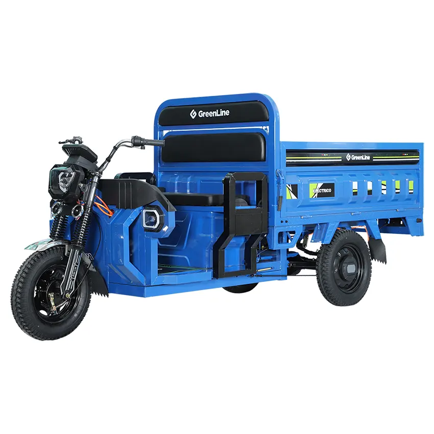 Trimoto eléctrica de carga con sistema 100% eléctrico, batería de plomo 60V45AH, motor 1200W. Chasis reforzado con tubos rectangulares, sistema de transmisión para alto torque que le ayuda a subir las subidas y llantas de 4.0-12.